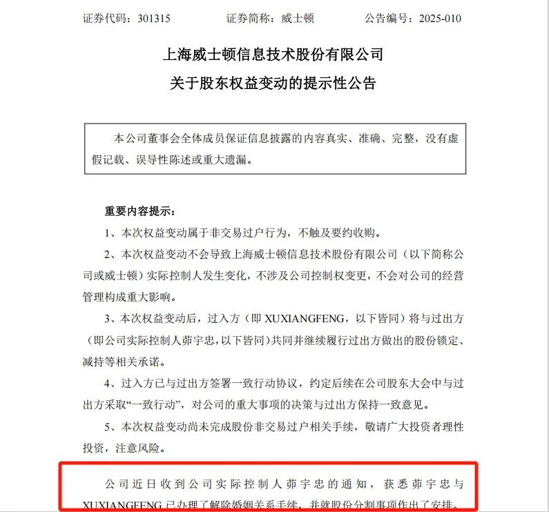 公告显示,近日,威士顿收到茆宇忠通知,获悉其与XUXIANGFENG已办理解除婚姻关系手续,并就股份分割事项作出安排。